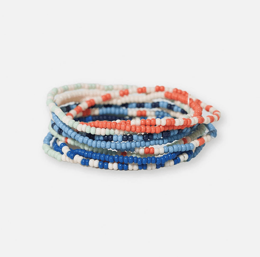 Sage Mixed Stripe Beaded 10 Strand Stretch Bracelet Set Teal + Poppy