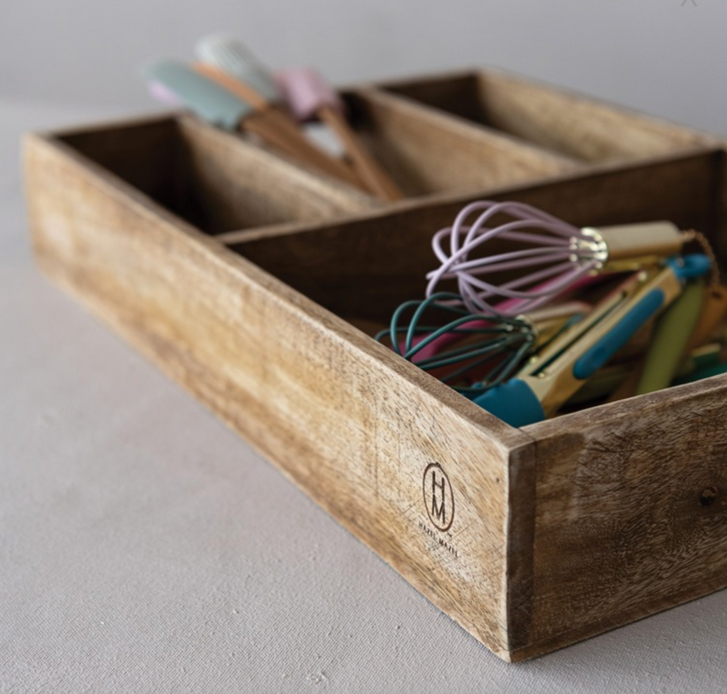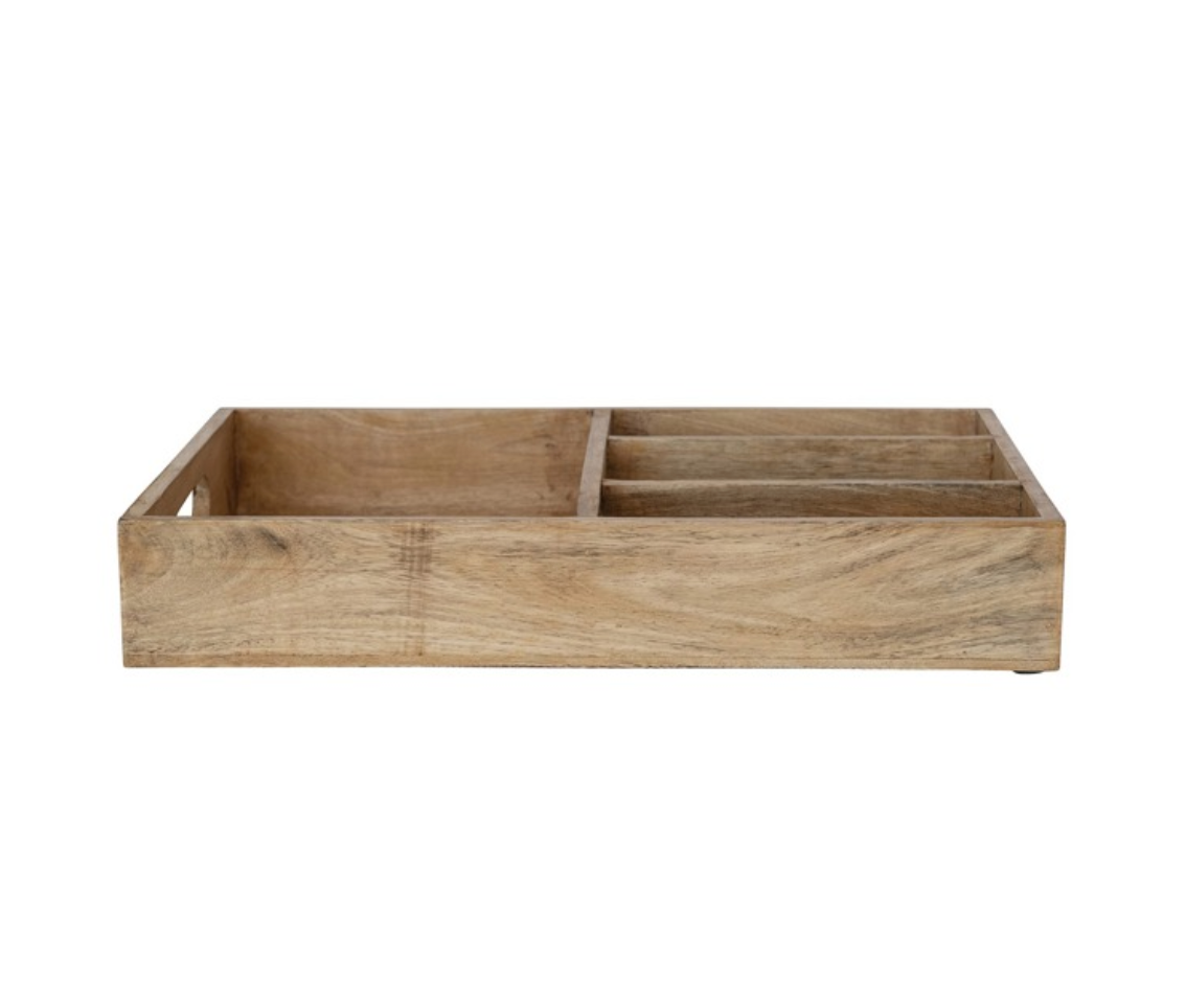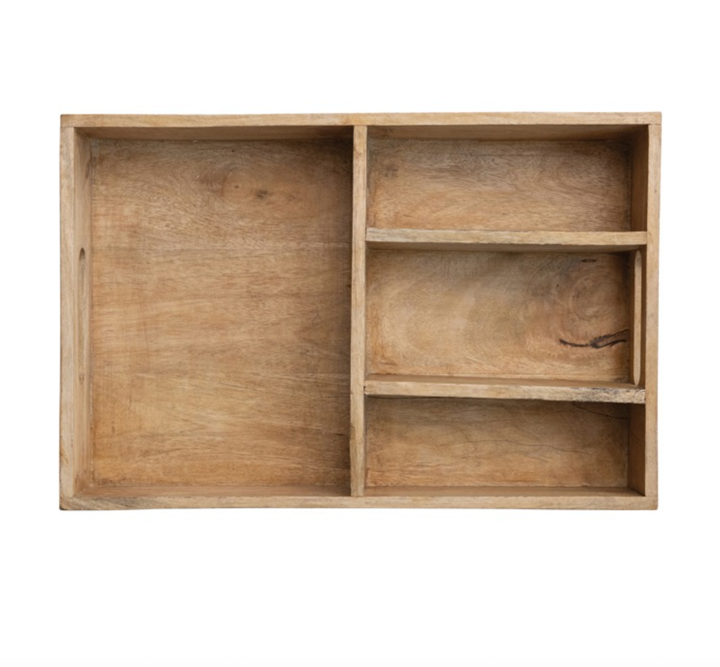 Made from high-quality mango wood, this 18"L x 3"H tray is not only durable but also adds a touch of elegance to any space. The handles make it easy to carry, while the 4 sections allow for easy organization of snacks or small items. The natural wood grain adds a rustic charm that complements any decor style. Whether you use it for serving appetizers at a party or keeping your desk clutter-free, this tray is both functional and stylish. Elevate your home decor with this versatile and beautiful mango wood tray.