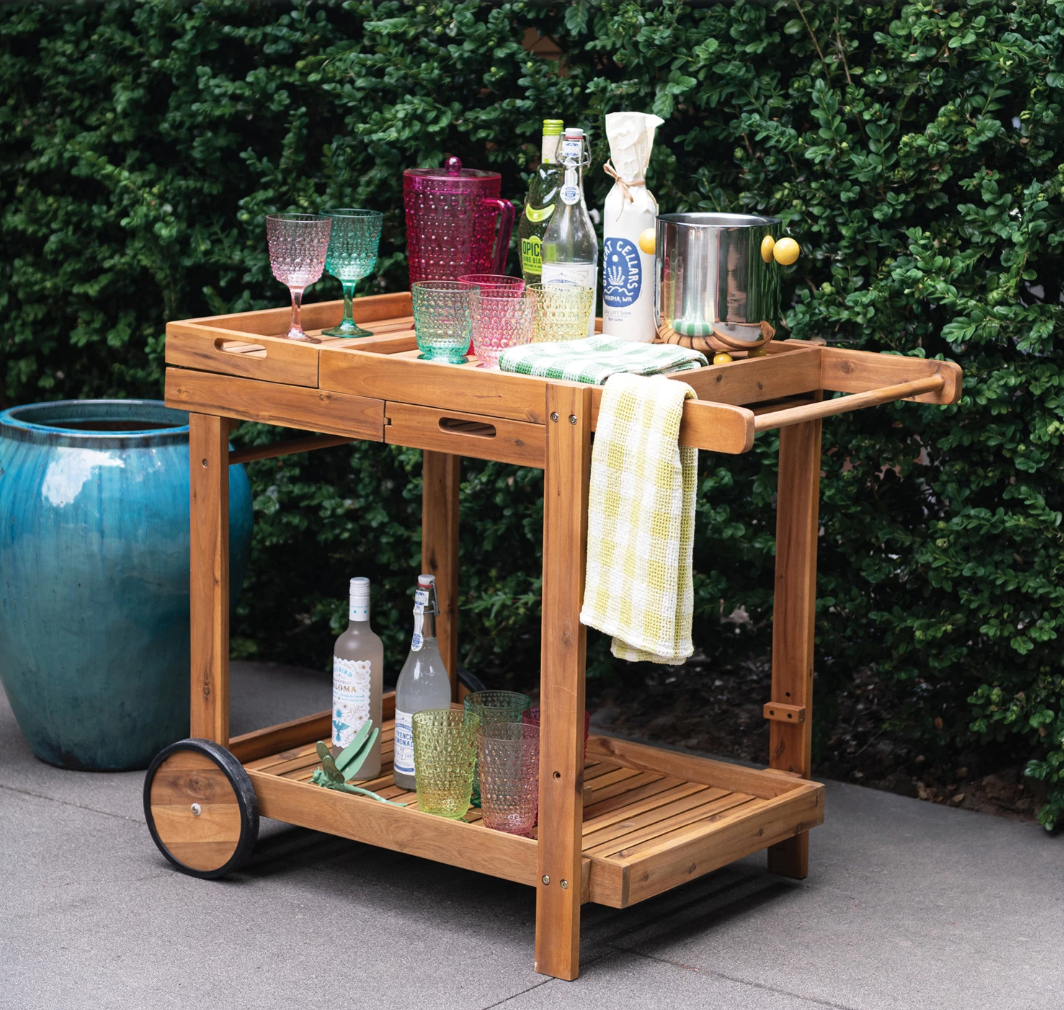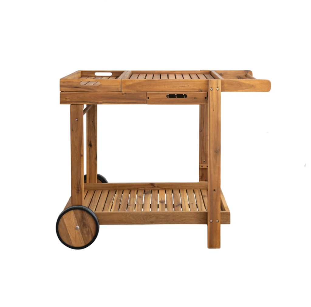 Acacia Wood Indoor/Outdoor 2-Tier Slatted Bar Cart on Wheels w/ Drawer & Removable Tray