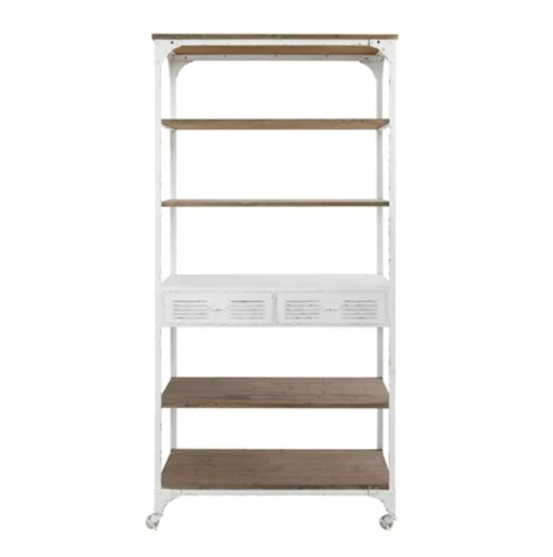 There are 5 shelves and 2 drawers in this amazing piece. The combination of metal and wood give it a special country charm.. The best part is that it is on casters and easily movable.