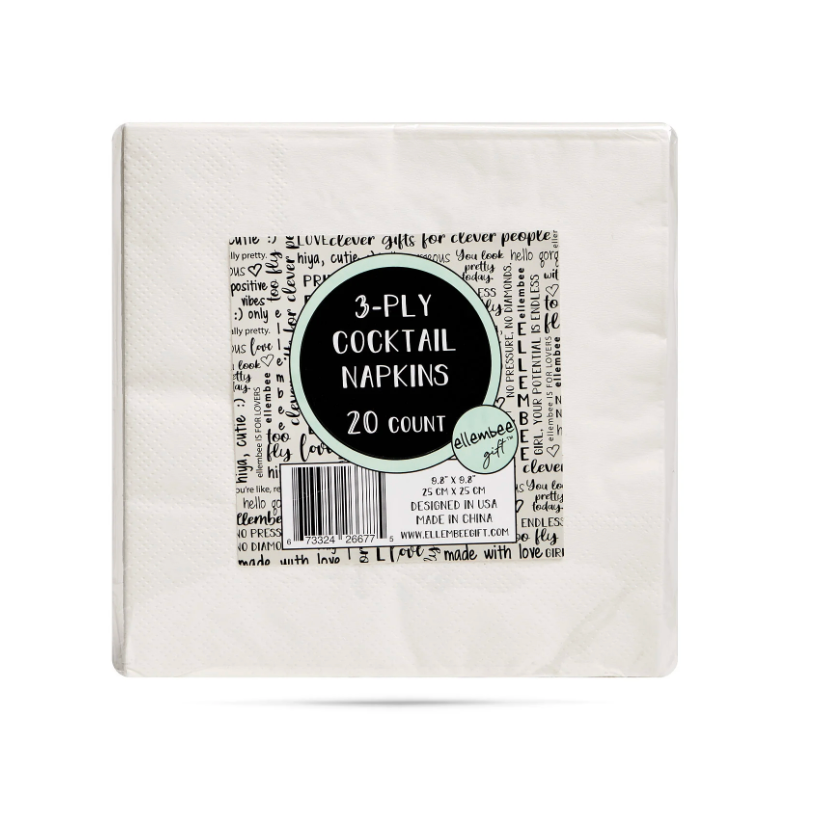 Our 3-ply, 5x5 folded, white napkins are printed with crisp black ink. They come cellophane wrapped in packs of 20, and we think they're some of the funniest on the market! (If we do say ourselves.) Why not add a little sass to your next cocktail party?! They even make a great hostess gift with a bottle of wine!