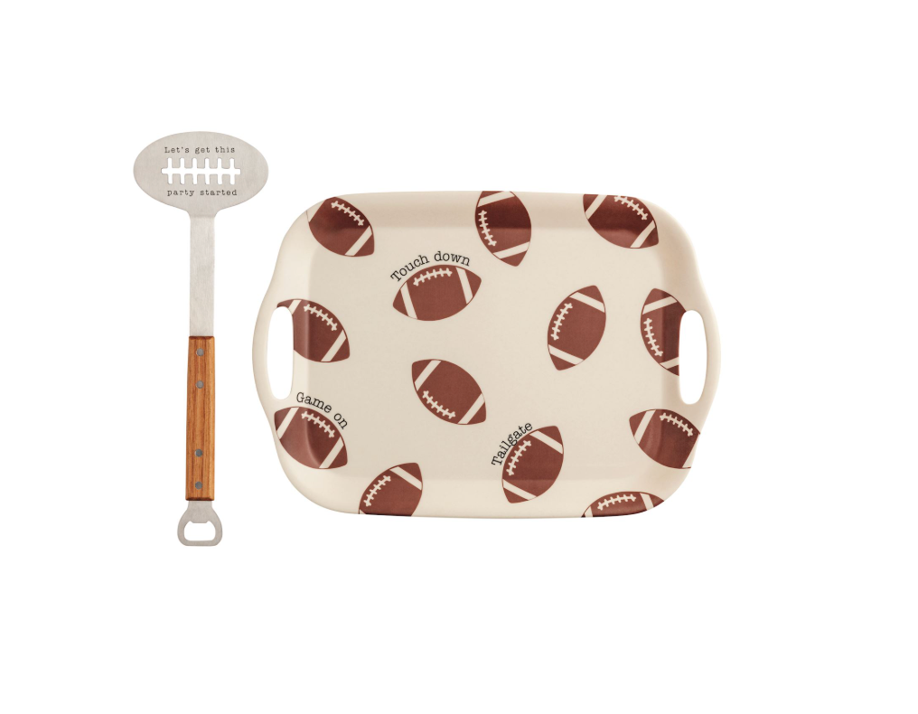 2-piece set. Melamine tray. Comes with wood and stainless steel spatula with attached bottle opener.