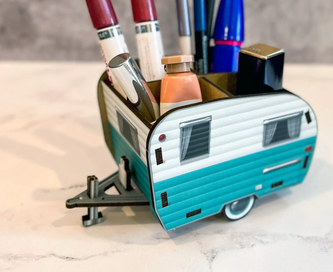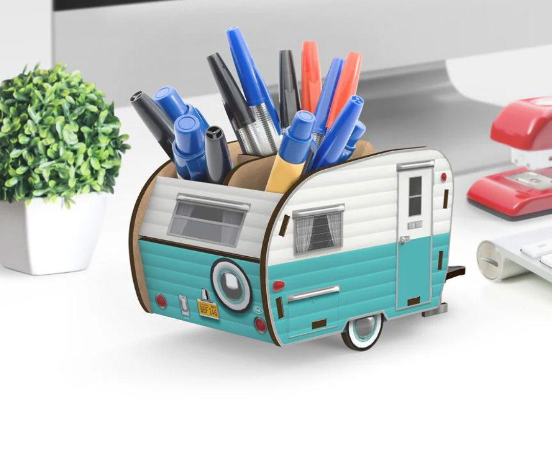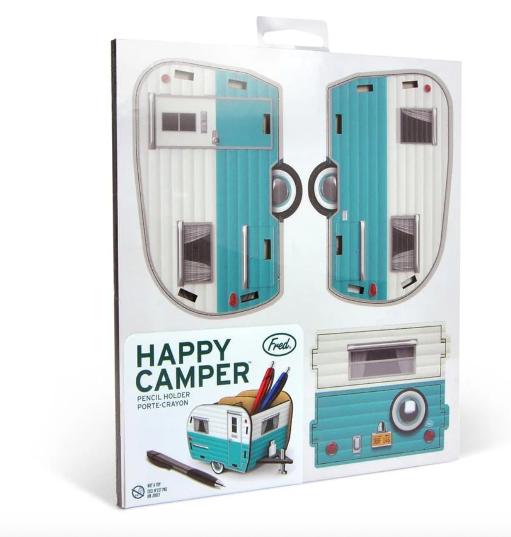 Park this retro-styled camper on your desk, toss in your pens and pencils, kick back and relax. Fred's all-season HAPPY CAMPER pencil holder comes flat-packed with simple instructions for quick and easy assembly. Made of durable MDF.
