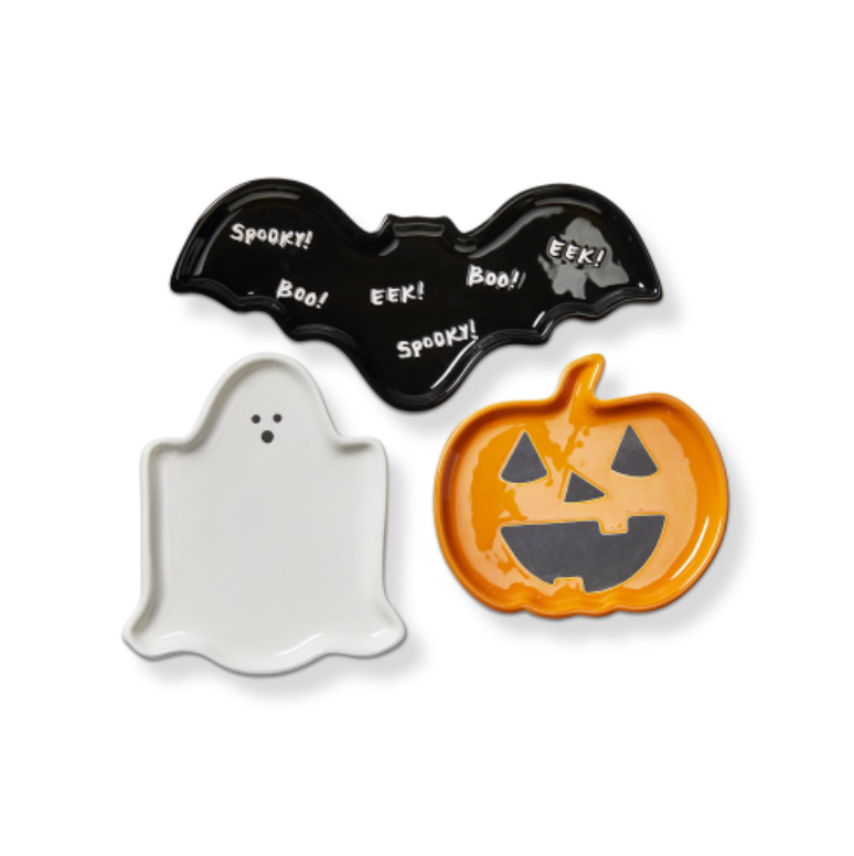 Decorate your spooky Halloween spread with our 3-piece Happy Halloween appetizer plates set! Featuring a black bat, ghost, and jack-o-lantern, these plates will add a touch of whimsy to your party.