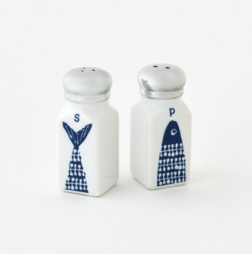 Add a touch of whimsy to your dining experience with the Porcelain "Heads or Tails" Fish Salt & Pepper Shakers. Made from high-quality porcelain, these shakers feature a playful navy blue fish print and are labeled for easy use. Their simple design and color make them a versatile addition to any kitchen.