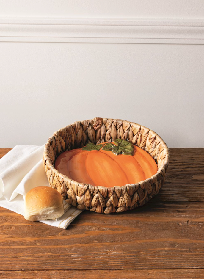 2-piece set. Hand-painted stoneware pumpkin warming slab comes with seagrass basket.