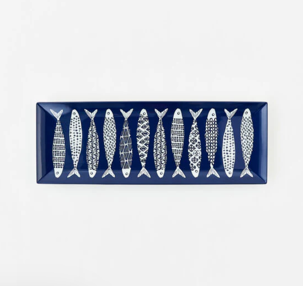 The navy blue and white School of Fish Melamine Sandwich Tray features a charming aquatic design, with a pattern of swimming fish across its surface. Made from durable, lightweight melamine, this tray is perfect for casual dining, serving sandwiches, snacks, or small dishes. Its nautical theme and sturdy construction make it ideal for both indoor and outdoor use.