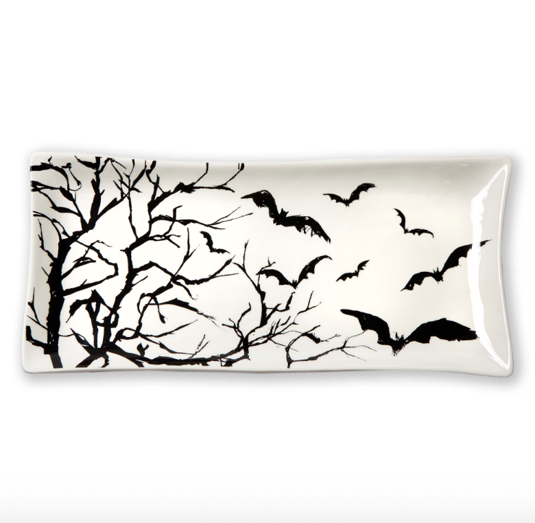 Create a Halloween and stylish tablescape with this Spellbound Rectangular Platter. Made from earthenware, this platter features a dramatic black and white design with spooky black branches and bats.
