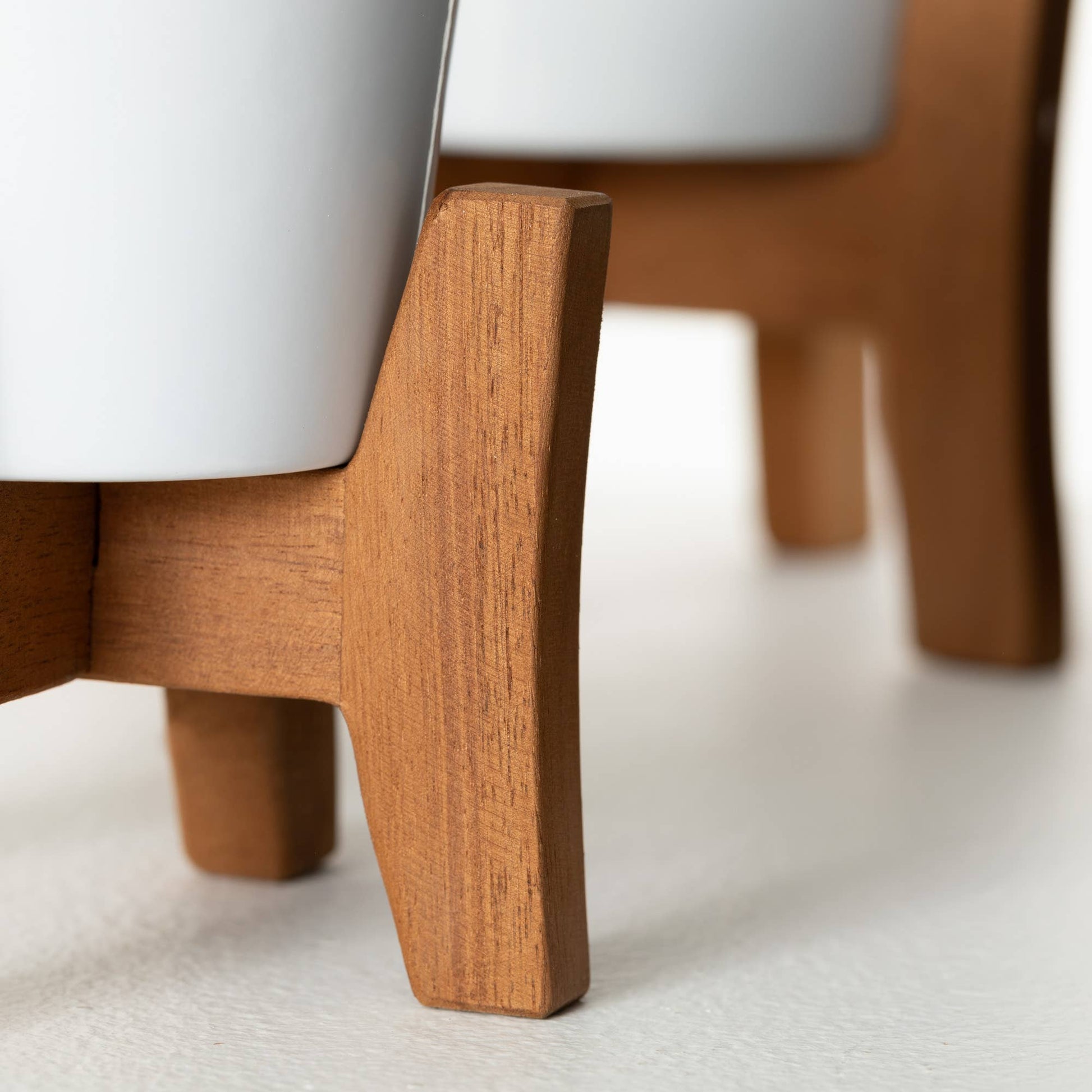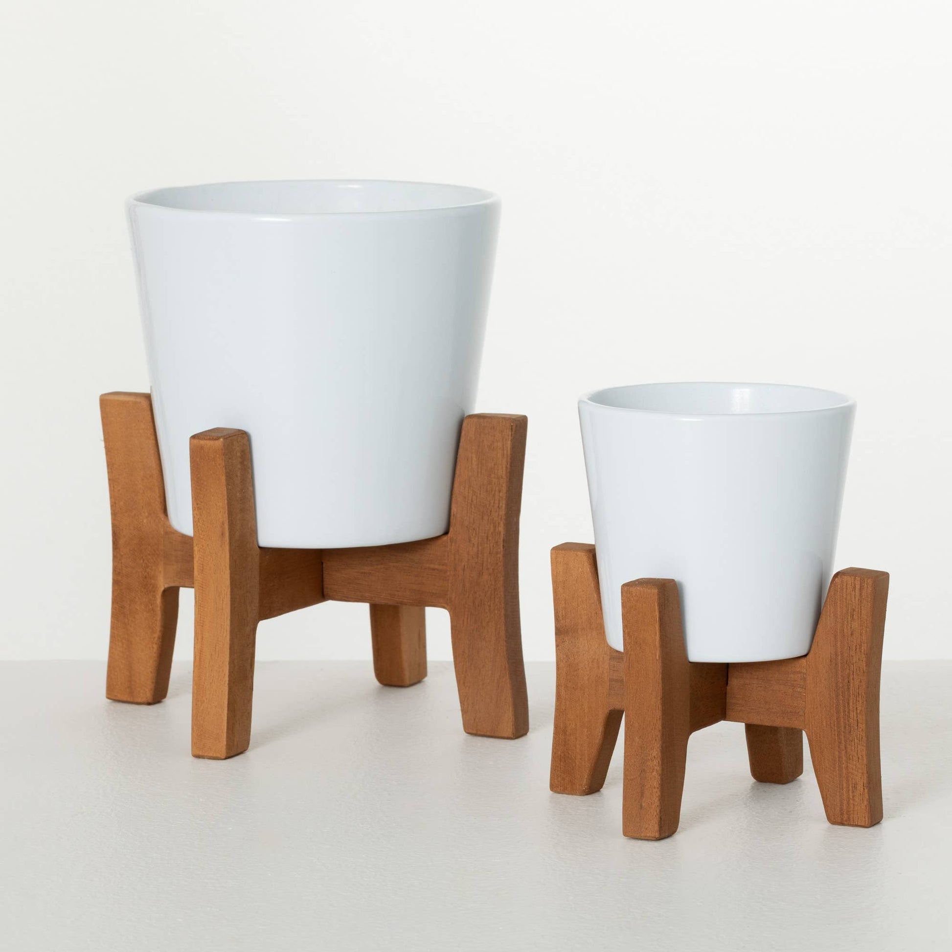 Elevate your indoor or outdoor decor with these White Planter Stands from Sullivans. Crafted with a chic white powder-coated ceramic body and light wood accents, these versatile stands add a touch of modern style to any space. A built-in drainage hole and included rubber plug are perfect for housing your favorite potted plants, greenery, or succulents. These compact stands make it easy to create a cohesive, elevated display, whether you're dressing up a patio, porch, or living room. Versatile, durable, and decidedly on-trend, these Planter Stands are a must-have for any plant enthusiast or design-savvy homeowner.
